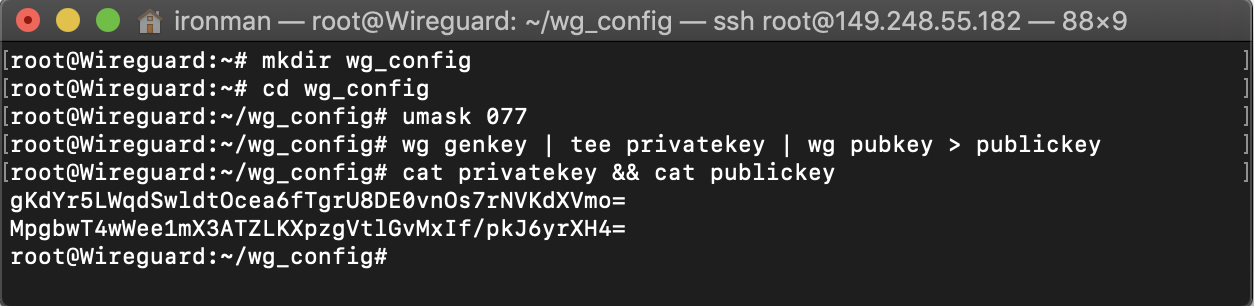 Next, it’s necessary to generate public/private key pairs for the peers. Create a new directory for the WireGuard keys (making an actual file isn’t necessary, but the output of the commands is important):