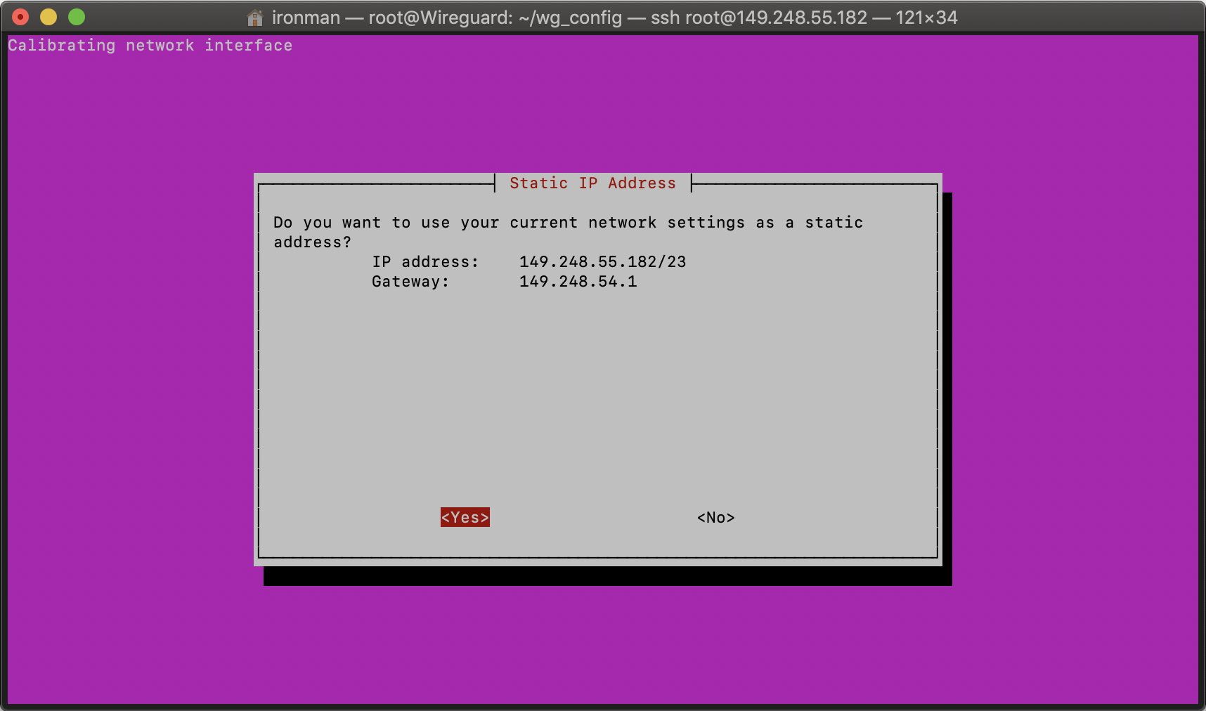 When asked for a static IP address, provide the IP you assigned to this server inside the VPN. Use this same IP as the default gateway, then click OK: