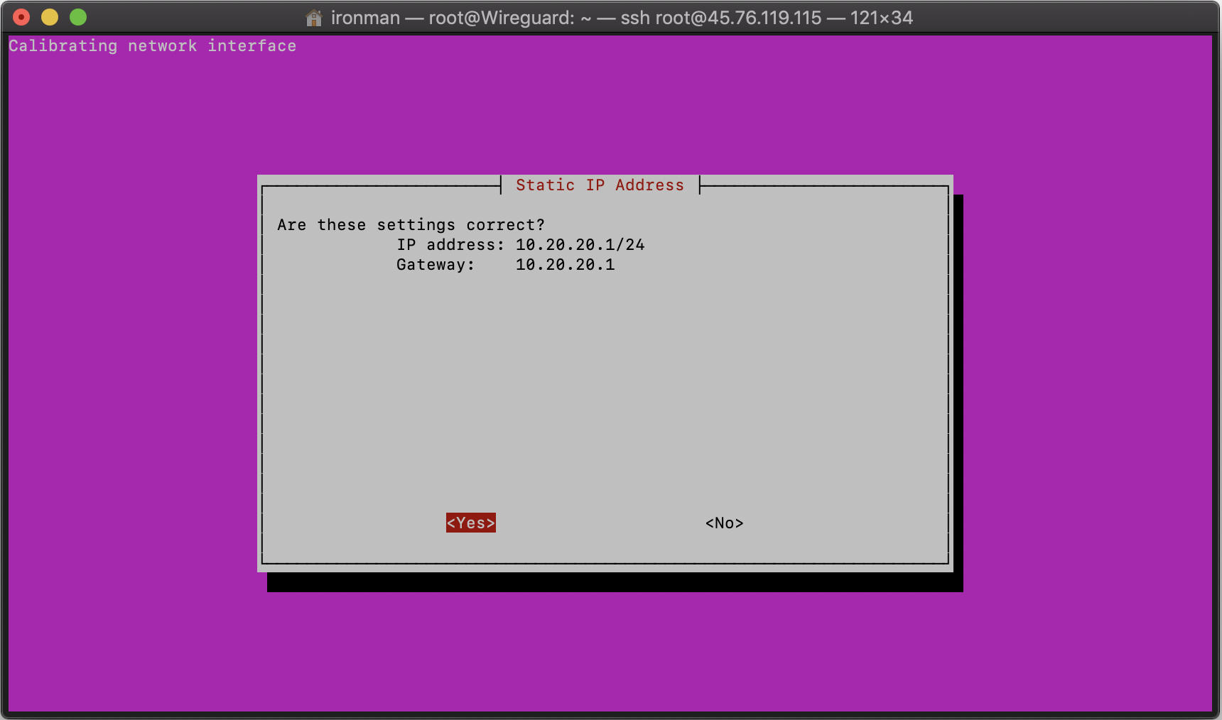 Click OK on the static IP information page. Select the WireGuard interface (wg0 if you followed the instructions above), then click OK:
