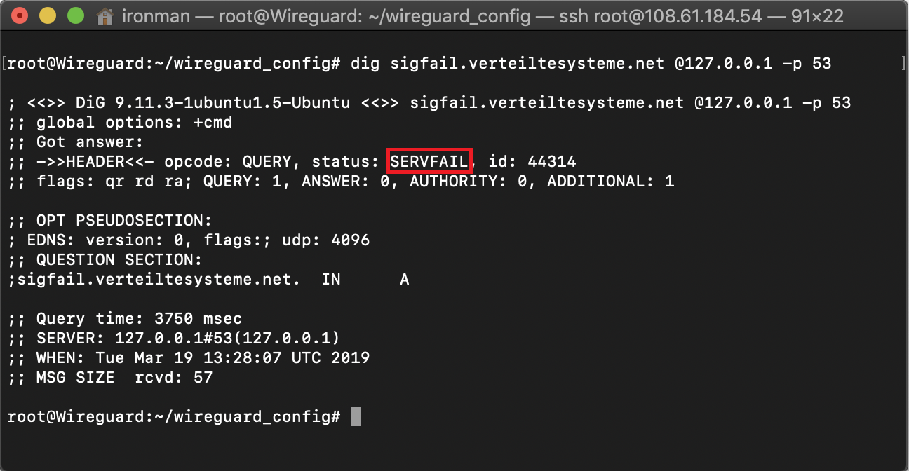 This command should return SERVFAIL to indicate DNSSEC is working: